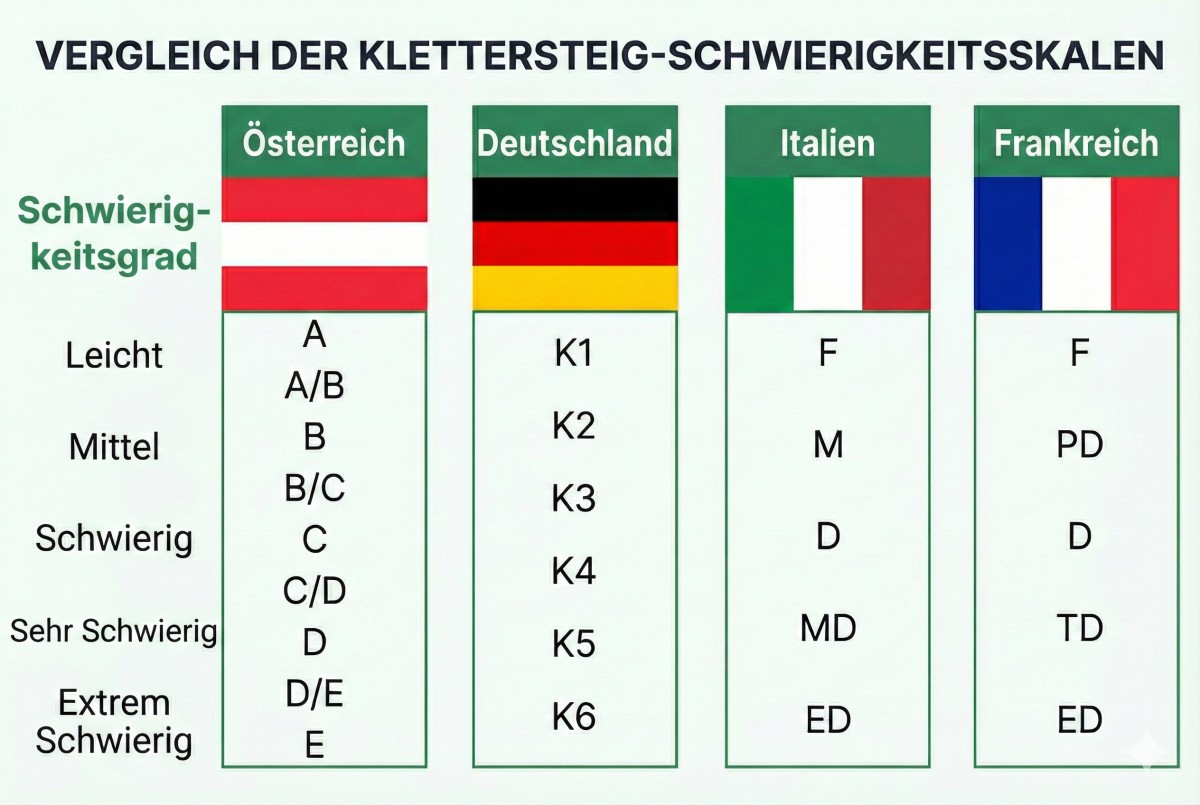andere Länder, andere Sitten! Und leider hat jedes Alpenland seine eigene Skala. Ich verwende die, die ich am besten kenne - die österreichische. Und diese werde ich gleich genauer erklären. Unten hast du eine Übersicht der Skalen in den einzelnen Ländern: