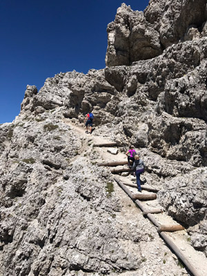 via ferratą Kaiserjägersteig. Moim zdaniem najciekawszy wariant. Aby nim wejść musimy iść szlakiem wzdłuż stoku narciarskiego, po ok. 500 metrach trzeba odbić w lewą stronę. Jest to prosta via ferrata o trudności A na której nie potrzeba mieć sprzętu. Aczkolwiek poleciłbym wypożyczyć przed wejściem kask i czołówkę do zwiedzania tuneli z czasów I Wojny Światowej.Kaiserjägersteig Osobom nieobytym z górami (i ogólnie przewyższeniami) oraz dzieciom radziłbym dodatkowo wypożyczyć lonżę. Przezorności nigdy za wiele :) Po drodze czeka nas jeden most i parę ciekawych miejsc zabezpieczonych liną stalową. Piękna, zróżnicowana trasa z towarzyszącym nam widokiem na Marmoladę i grupę Selli. Dolomity pełną gęba !