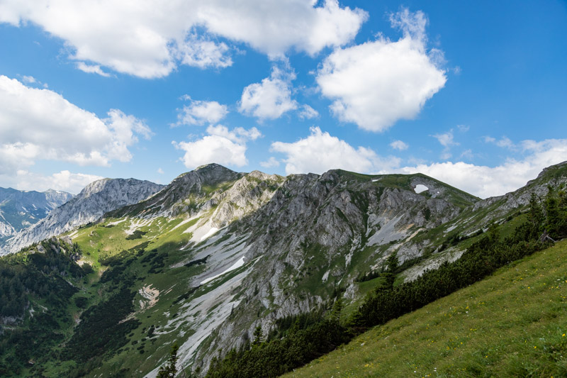 Aby dotrzeć do celu pierwszego dnia podróży, czyli schroniska Schiestlhaus mamy dwa warianty - albo szlakiem niższym, wiodącym przez dolinę Seetal i schronisko Voisthaler Hütte, albo górą, płaskowyżem zwanym Aflenzer Staritzen. Ja wybrałem oczywiście ten drugi wariant i Tobie też to radzę. Widoki robią niemałe wrażenie, a do tego trasa jest bardzo urozmaicona. Jedynym minusem jest to, że przez około 6 prostych technicznie godzin wędrówki nie napotkamy żadnego schroniska.