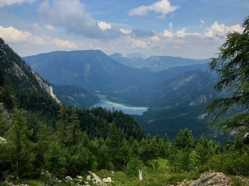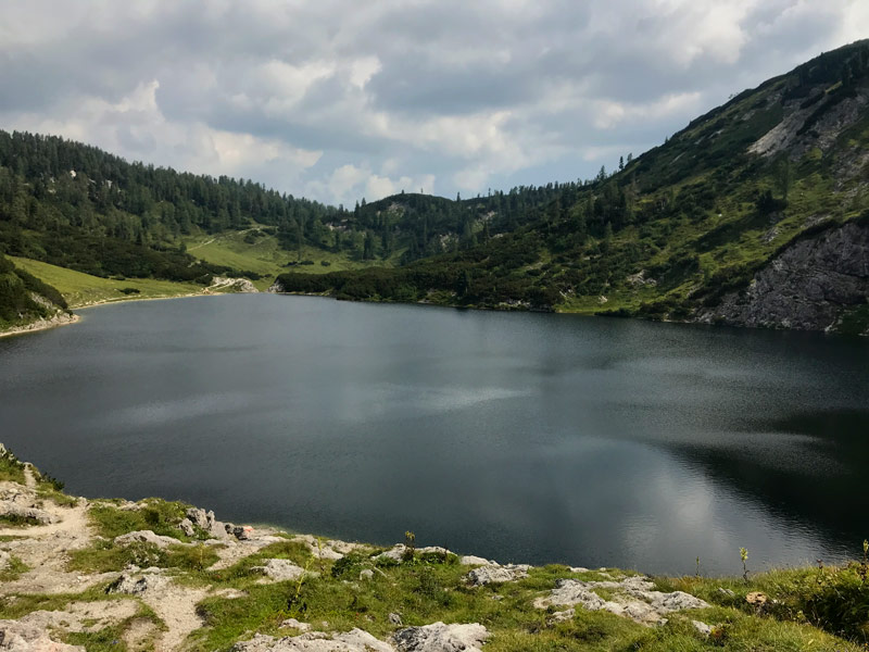 widoke ze szczytu Rinnerkogel. W dole można dojrzeć Traunsee. Wysoki na 2012 metrów Rinnerkogel to ciekawy cel dla każdego odwiedzającego schronisko i Wildensee. Jeśli masz siły i ochotę oczywiście, bo czeka Cię kolejne 500 metrów przewyższenia do pokonania. Czasowo trzeba liczyć około 3 godziny na całą przygodę. Szlak jest technicznie prosty, fajnie poprowadzony. Bardzo dobrze czuć krasowy klimat Totes Gebirge. Uwielbiam tutejsze skały, wyglądające jak zastygnięta masa. Ja zdecydowałem się wybrać na wschód słońca, mierząc się z ekstremalną pobudką o 4:30. O dziwo dałem radę wstać i wejść. Na szczycie wylądowałem przed godziną 6 i mimo licznych chmur przywitało mnie słoneczko. Widok był przepiękny, można było dojrzeć w dole Traunsee. Szkoda, że liczne chmury zasłaniały widok z drugiej strony - przy ładnej pogodzie dobrze widać Dachstein z jego lodowcami. Oczywiście pół godziny po zejściu ze szczytu niebo zrobiło się idealnie klarowne i naszły mnie myśli o powrocie do góry, które jednak porzuciłem kierowany burczeniem w brzuchu i wizją śniadania :)Trasa powrotna z Rinnerkogel