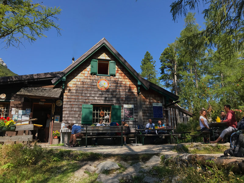 Rinnerhütte to miejsce całkiem nietypowe, bo jego właścicielem jest małe, lokalne stowarzyszenie górskie miejscowości Ebensee. Znajduje się ono w dolince pomiędzy szczytami Weißhorn (1755 m.n.p.m.), a Rinnerkogel (góra domowa schroniska - 2012 m.n.p.m.). Jest to niewielkie, przytulne schronisko prowadzone przez super wyluzowaną ekipę. Patrząc po gościach, przychodzą tu głównie lokalni mieszkańcy, aczkolwiek paru turystów też się przewinęło (np. para z Australii podróżująca camperem po Europie). Jedzonko mają pyszne, świeże na lokalnych składnikach. Karta nie jest zbyt obszerna, ale czego oczekiwać w miejscu, gdzie obsługa musi wnieść składniki na własnych nogach (jedynie napoje są transportowane za pomocą helikoptera). My na dzień dobry wsunęliśmy jajka ze świeżymi borowikami zapiekanymi pod górskim serem. Do tego pyszny, pełnoziarnisty chlebek pieczony na zakwasie. Dużo bardziej naturalnie się nie da :P Warto zaznaczyć, że nocleg (oczywiście w pomieszczeniu wspólnym) jest tani - 10 euro za osobę. Jest to miejsce całkiem oblegane, dlatego warto z wyprzedzeniem rezerwować nocleg (nam się za pierwszym razem nie udało). Luksusu prysznica nie uświadczymy, ale kto go potrzebuje, kiedy 20 minut łatwego spaceru dzieli nas od ...