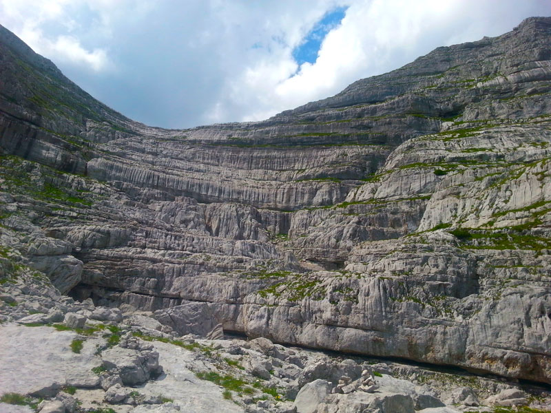 To widok na Sturzhahn, piękny szczyt. Idzie tam ciekawa ferrata o trudności CTutaj, w przeciwieństwie do dnia pierwszego, przewyższenie jest już większe. Co w połączeniu z duchotą gęstego iglastego lasu było męczące, ale po jakiś pół godziny zostawiliśmy linię drzew za sobą i weszliśmy w wyjątkowy krajobraz Totes Gebirge.Trzeba bardzo uważać gdzie się stawia stopy Kto był chociaż raz w tych okolicach, ten wie co mówię. Kto nie był może zobaczyć na zdjęciach, ale jak zwykle w najmniejszym stopniu nie oddają one tego klimatu co w rzeczywistości. Wędrując po Totes Gebirge trzeba uważnie obserwować szlak, żeby go nie zgubić. Schodzenie ze szlaku tutaj to bardzo niebezpieczna sprawa - charakter tych gór sprawia, że pełno jest wszędzie bardzo głębokich szczelin. Niestety nie było nam dane zobaczyć słynnej panoramy ze szczytu, gdyż musieliśmy zawrócić z wysokości ok. 1900 m.n.p.m ze względu na nadciągającą letnią burzę. Ale i tak wrażenia były niesamowite i dało się odczuć atmosferę tych gór. To był mój pierwszy kontakt z Totes Gebirge. Nie ostatni oczywiście :)